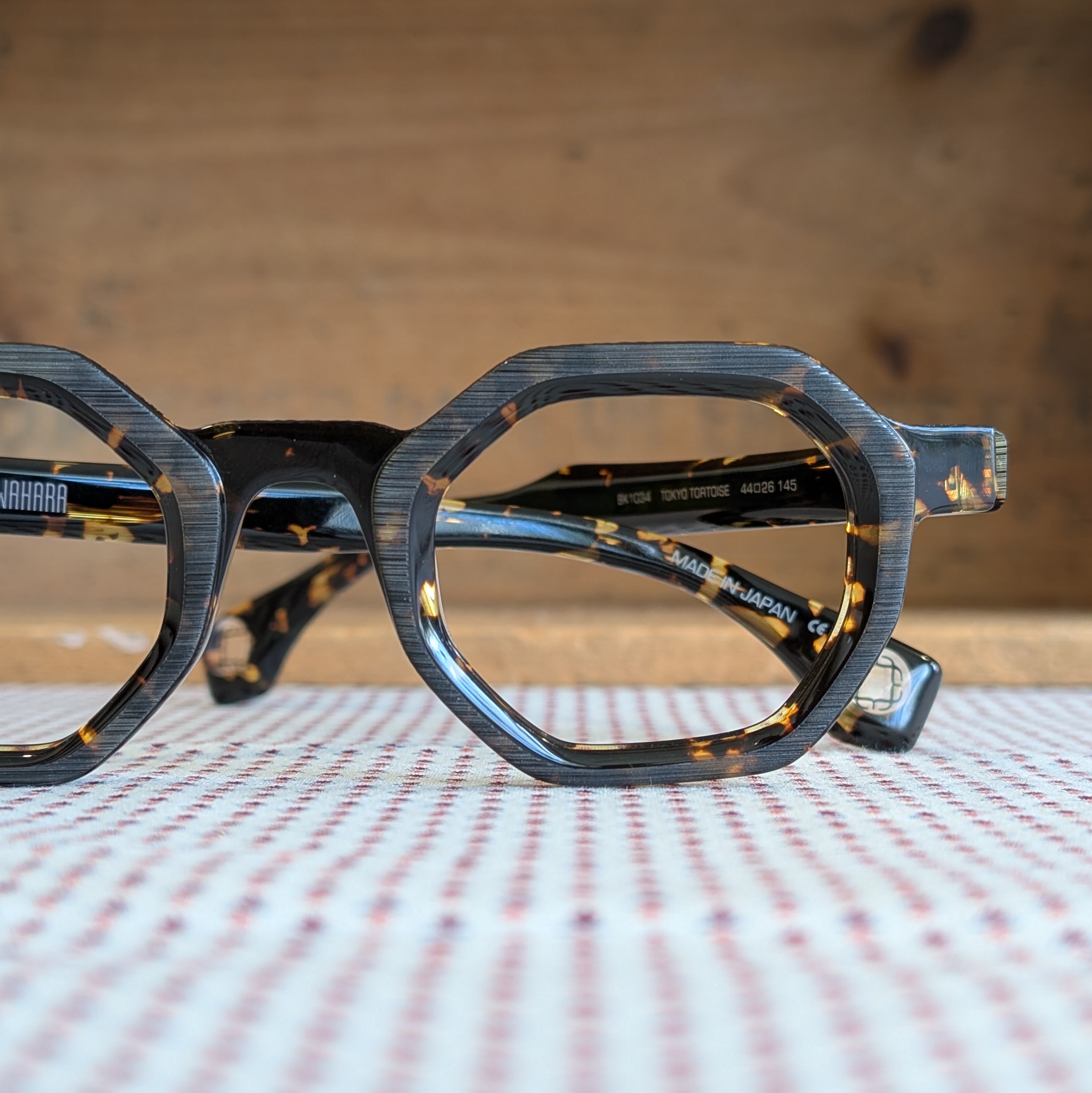 Texture is created on the front of the frame by using a metal brush. For added dimension, color is then rubbed by hand onto the surface. Texture on the top of the eye rim is created by using a small drill— all done by hand.
